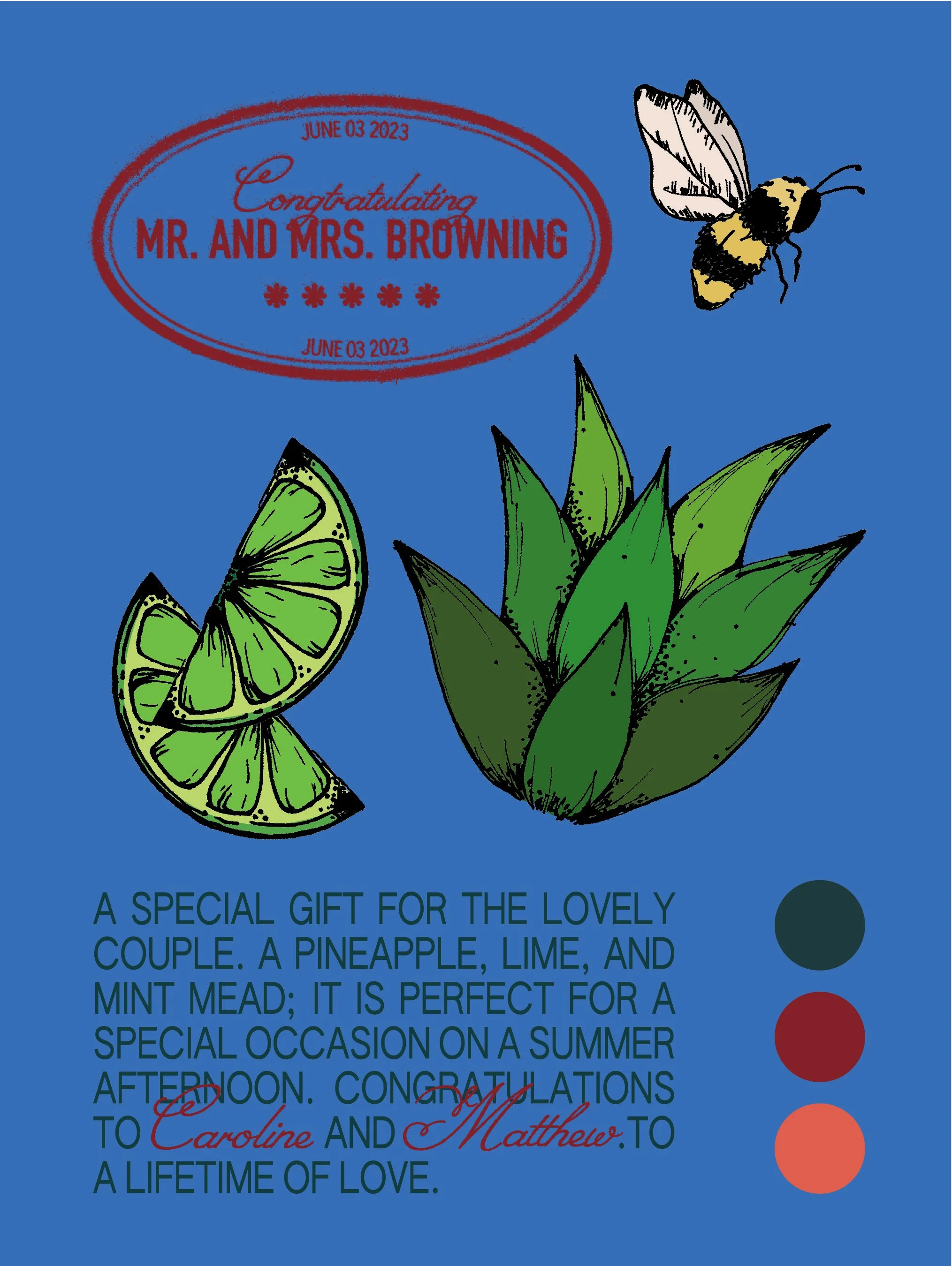I was contacted by Raven’s Claw Brewery located in Columbus, Georgia to make a custom label for a wedding. I would be making a celebratory label for a pineapple, lime, and mint mead. When taking on this project, I wanted to challenge the classic wedding day alcohol packaging by creating a label that recognizes the event while presenting the mead itself.